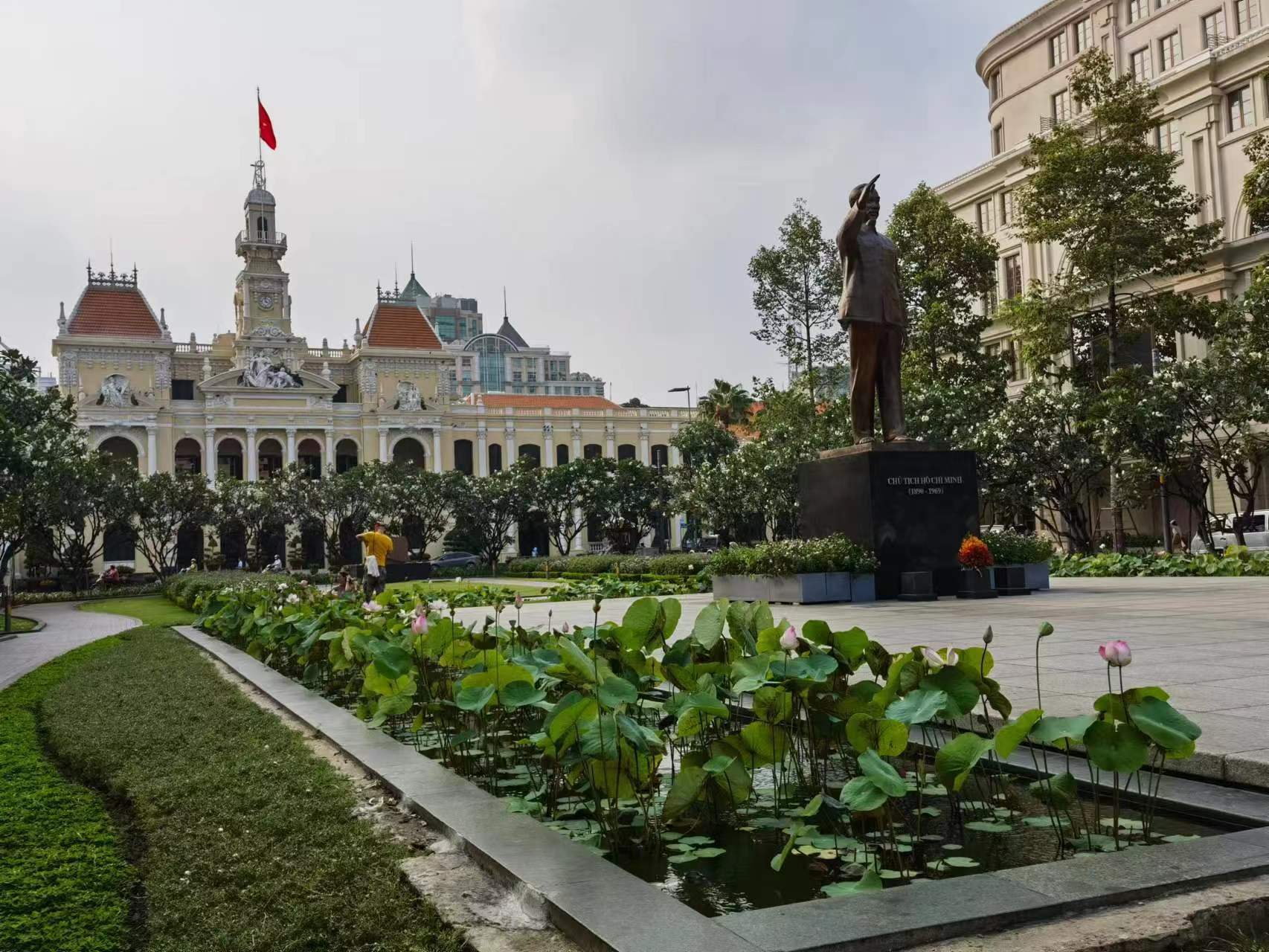 回国我挑了凌晨的航班,所以下午就到胡志明,开了一个房间,充分休息,以便凌晨2:35分起飞,7:35分就到浦东了。刚好酒店旁边就是胡志明广场,胡志明像背后是法式的古老的建筑。由于是下午,天气正热的时候,人较少,胡志明像周围荷花盛开,广场周围很多奢侈品店,这里也是一个网红打卡地,值得过来兜兜。
